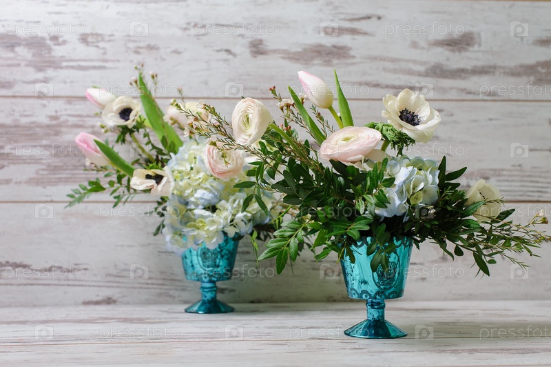 Два букета в голубых винтажных вазах