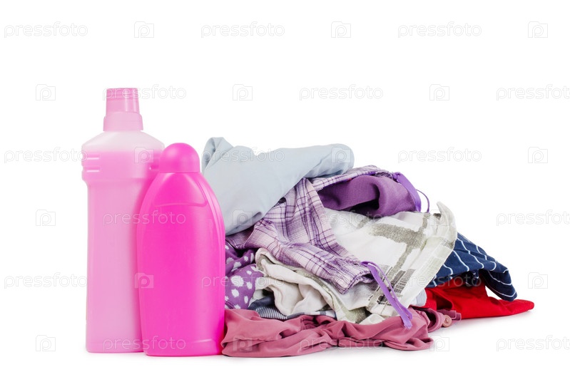 Постиранные вещи и две бутылки с моющими средствами