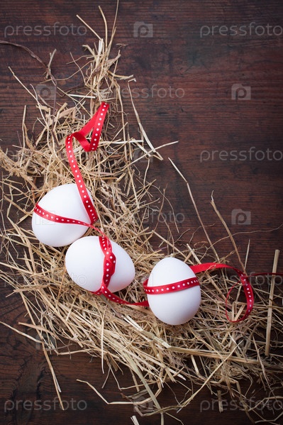Яйца с красной лентой на сене