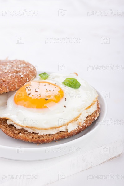 Булочка с яйцом, творогом и свежим базиликом на белом фоне для завтрака