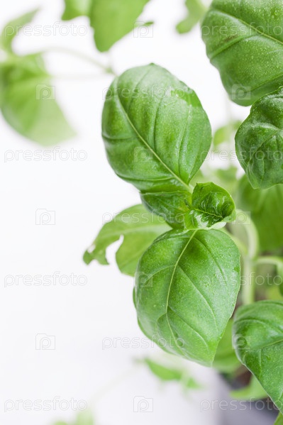 Свежий зеленый итальянский базилик на белом фоне. Крупным планом, выборочный фокус