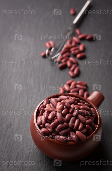 Красная фасоль в красной керамической миске на фоне камня