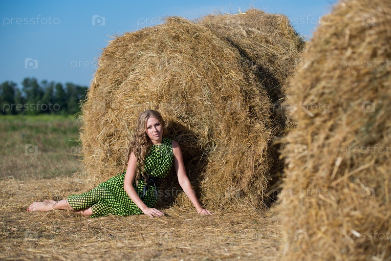 Хорошенькая молодая девушка у стога сена