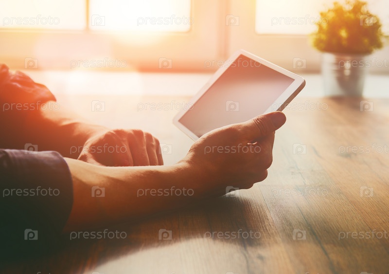 Человек, глядя на цифровой планшет