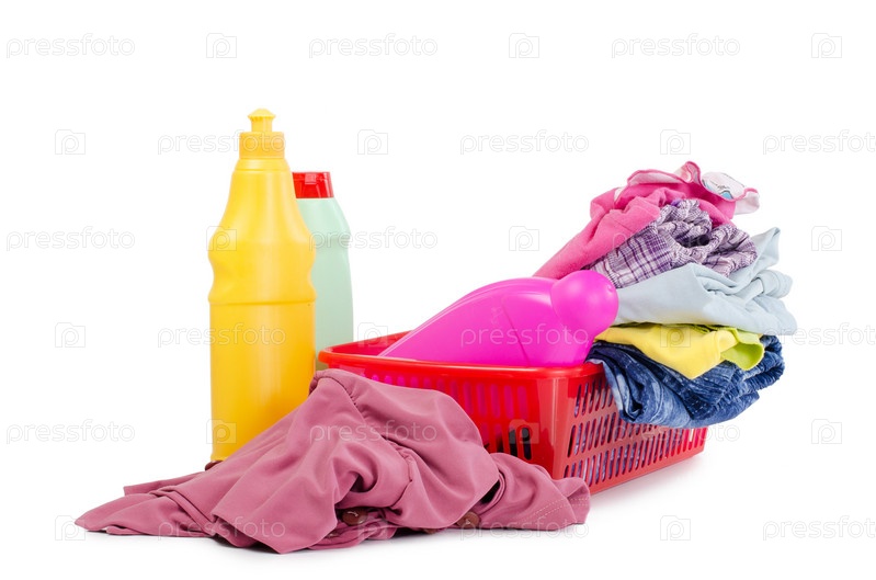 Постиранные вещи и бутылки с моющими средствами на белом фоне