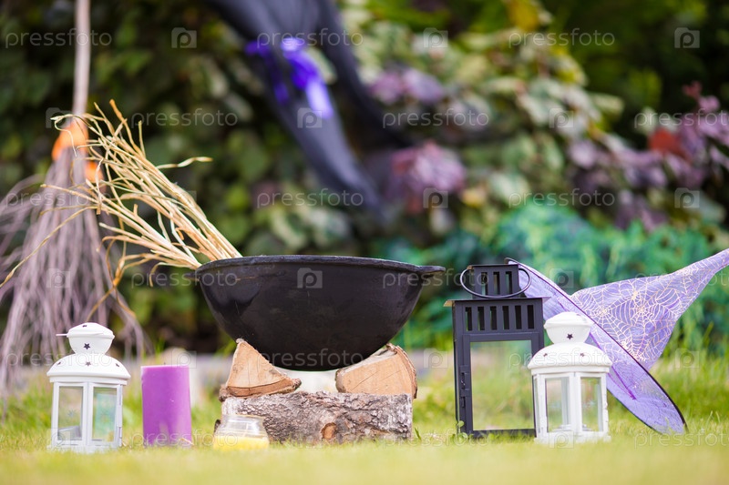 Хэллоуин аксессуары: горшок, шляпа, веник, свеча, чеснок и фонари