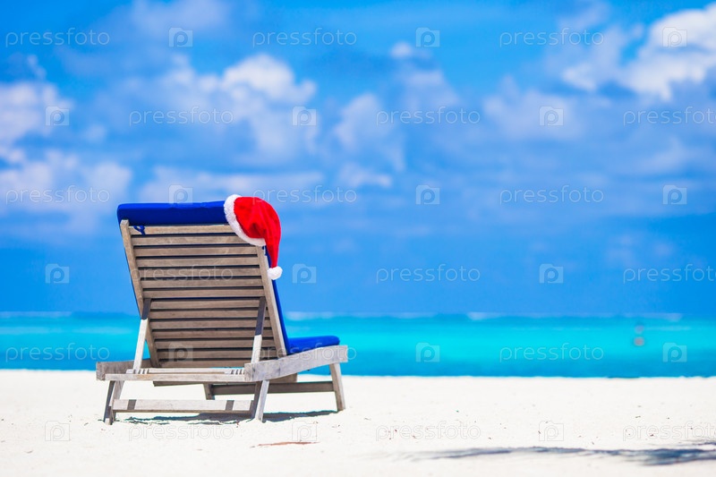 Красный колпак Санта-Клауса на пляжном шезлонге