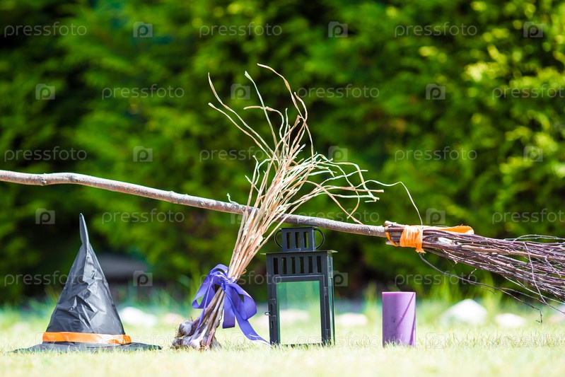 Хэллоуин аксессуары: шляпа, веник, свеча, чеснок и фонари