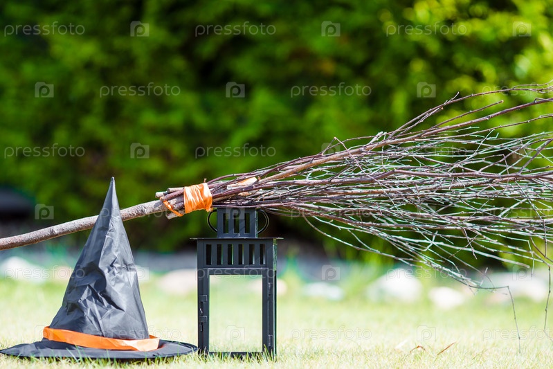 Хэллоуин аксессуары: шляпа, веник, свеча, чеснок и фонари. Кошелек или жизнь