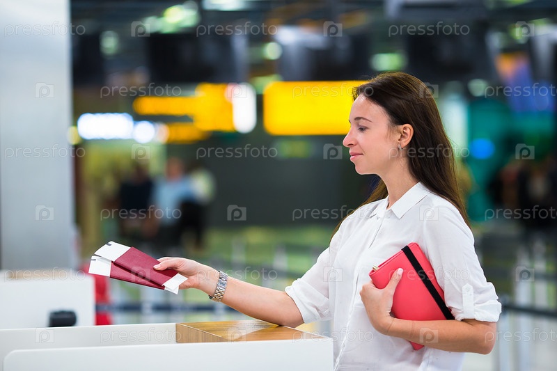 Молодая девушка с паспортами на стойке регистрации аэропорту