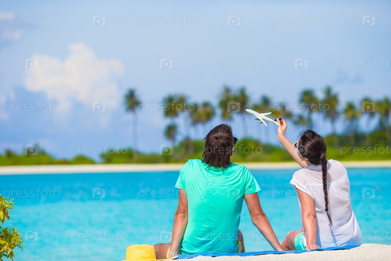 Молодая пара на белом пляже в летние каникулы