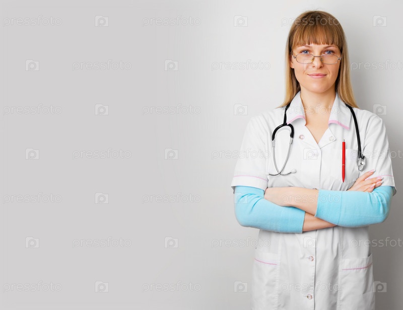 Женщина-врач на сером фоне с пространством для текста