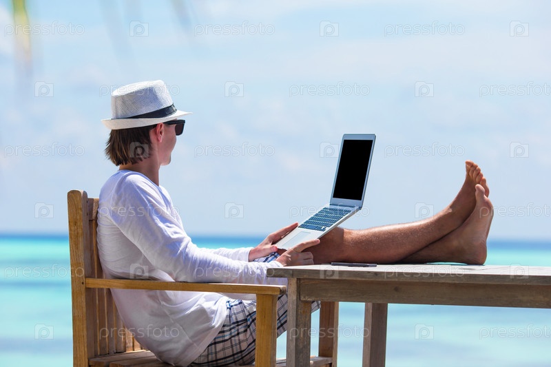 Молодой человек, работающий в открытом кафе