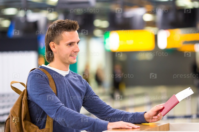 Красивый мужчина с паспортами в аэропорту