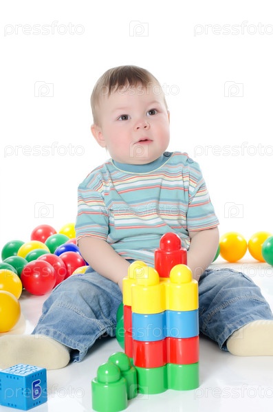 Маленький мальчик играет разноцветными игрушками