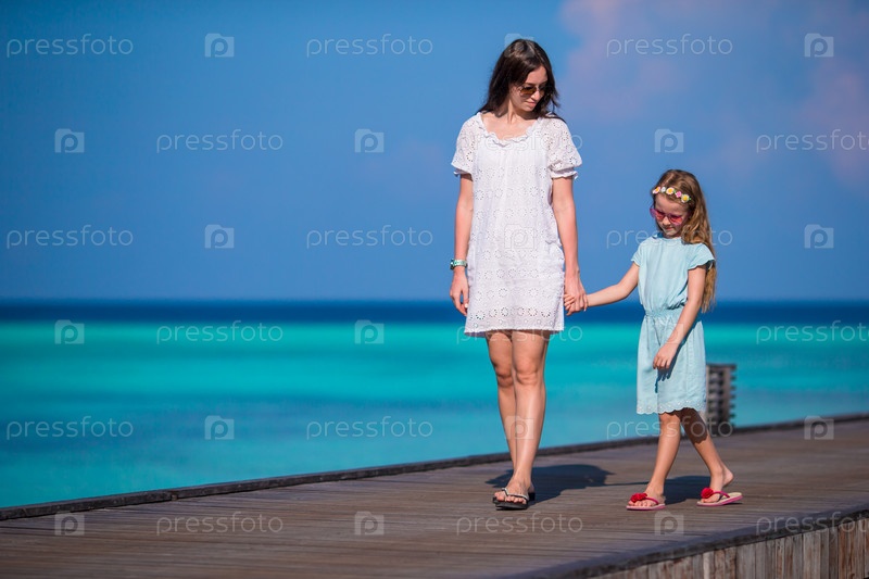 Мать и дочь гуляют по пирсу