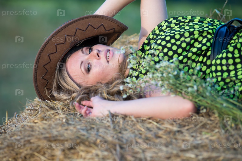 Хорошенькая молодая девушка на стоге сена