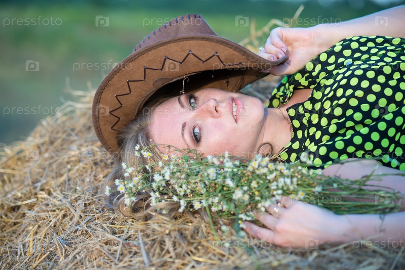 Хорошенькая молодая девушка на стоге сена