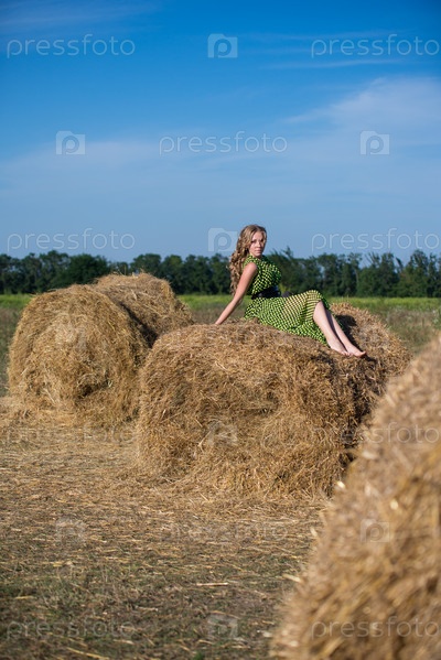 Хорошенькая молодая девушка на стоге сена