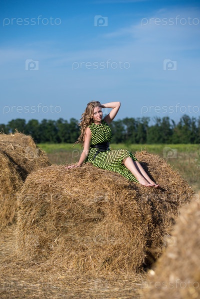 Хорошенькая молодая девушка на стоге сена