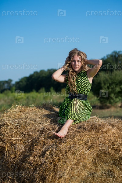Хорошенькая молодая девушка на стоге сена