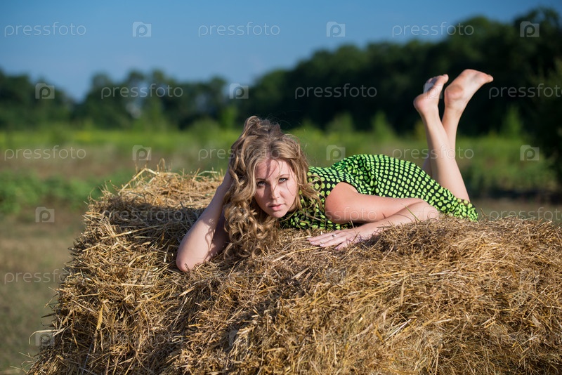 Хорошенькая молодая девушка на стоге сена