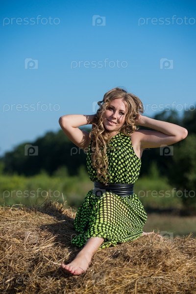 Хорошенькая молодая девушка на стоге сена