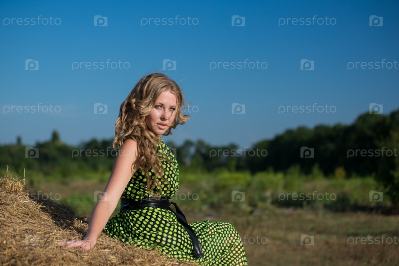 Хорошенькая молодая девушка на стоге сена