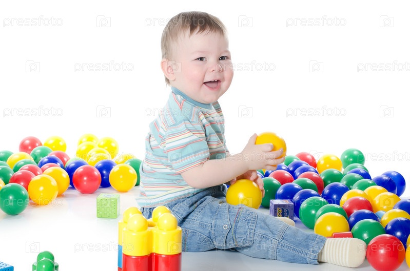 Маленький мальчик играет с разноцветными игрушками на белом фоне