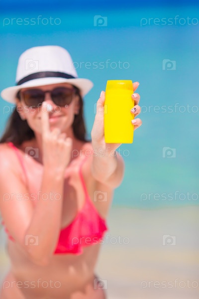 Счастливая женщина, применяя лосьон для загара