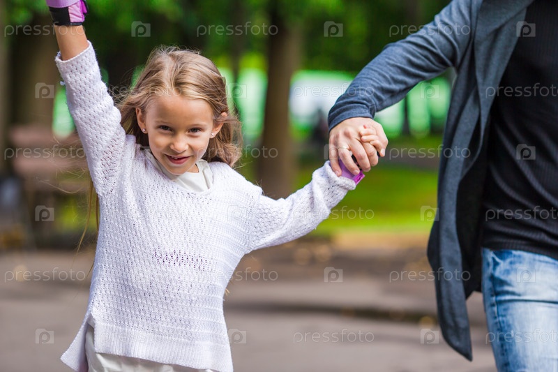 Девочка на роликах в парке со своим отцом