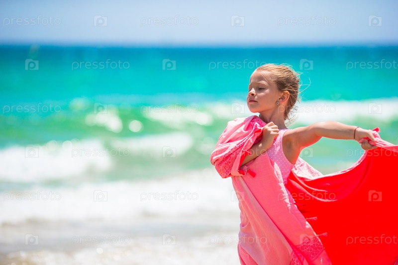 Маленькая девочка веселиться с пляжным полотенцем