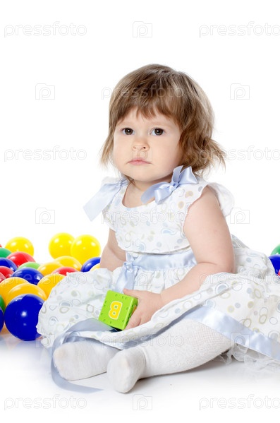 Маленькая девочка играет с разноцветными игрушками на белом фоне
