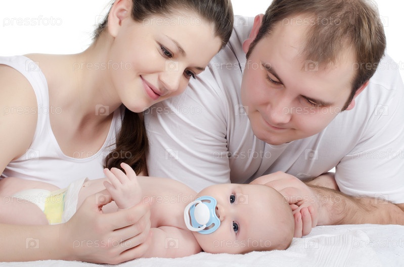 Портрет молодой счастливой семьи с ребенком на белом фоне