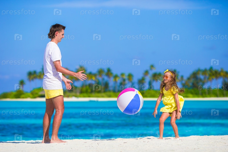 Счастливый отец и дочь играют на пляже с мячом