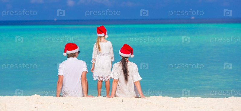 Счастливая семья на пляже в рождественских шапках