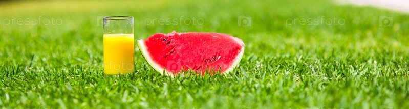 Стакан сока и арбуз на траве