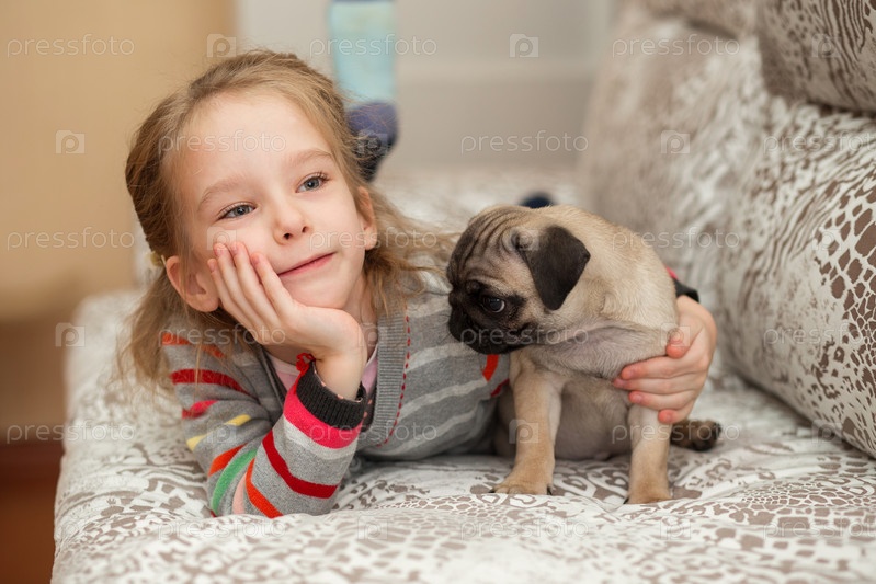 Щенок мопса с девочкой