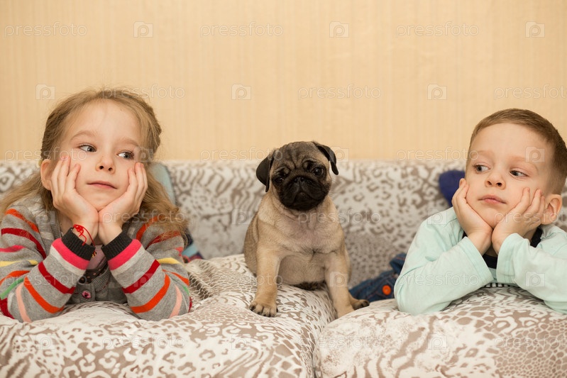Щенок мопса и симпатичные дети