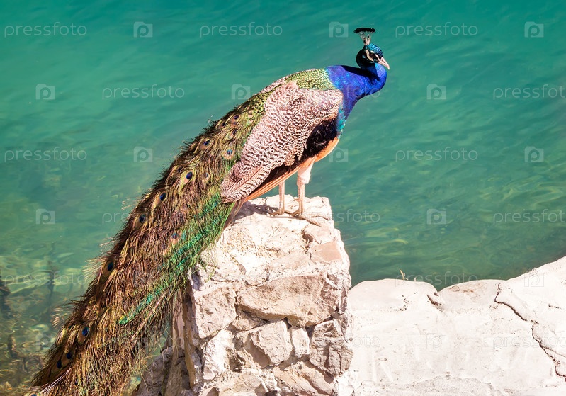 Павлин на камне у озера