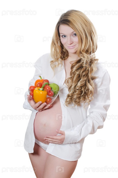Беременная женщина с овощами, изолирована на белом фоне