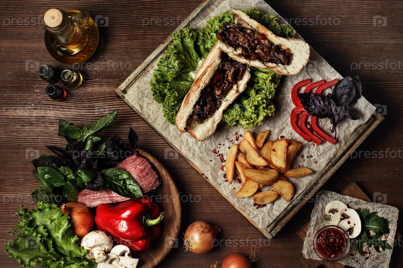 Домашний гамбургер с картофелем, помидорами черри и соусом барбекю