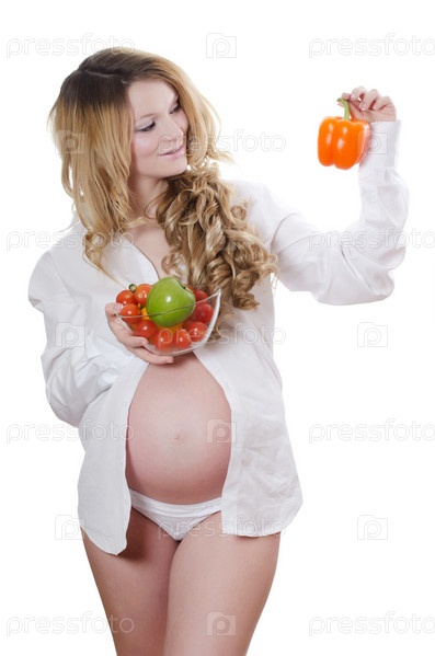 Беременная женщина с овощами, изолирована на белом фоне