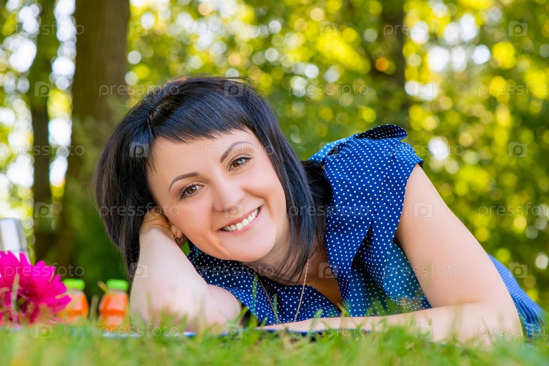 Веселая молодая женщина лежа на пикнике