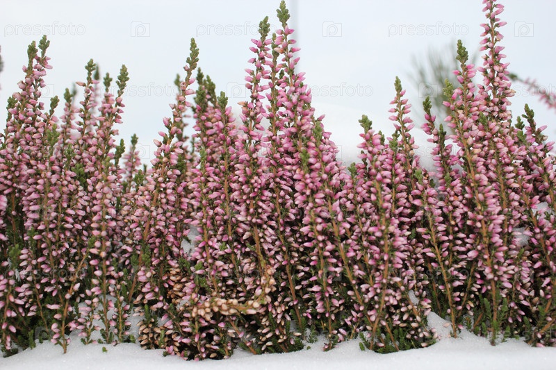 Розовые декоративные цветки вереска на снегу