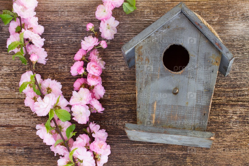 Ветки с цветами вишни и птичья клетка