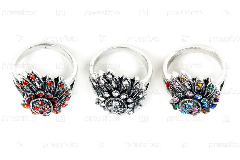 Три серебряные кольца с драгоценными камнями на белом фоне