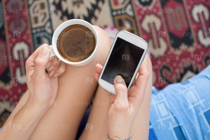 Девушка с кофе в кровати, держа смартфон