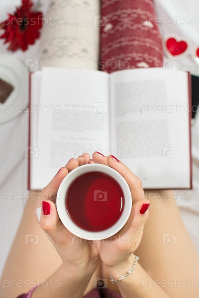 Женщина с чашкой чая и книгой в постели