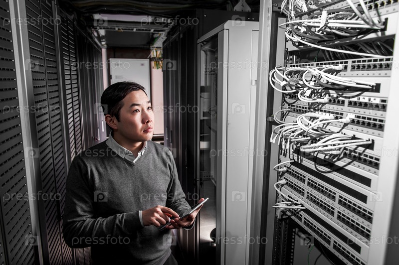Молодой инженер в серверной комнате